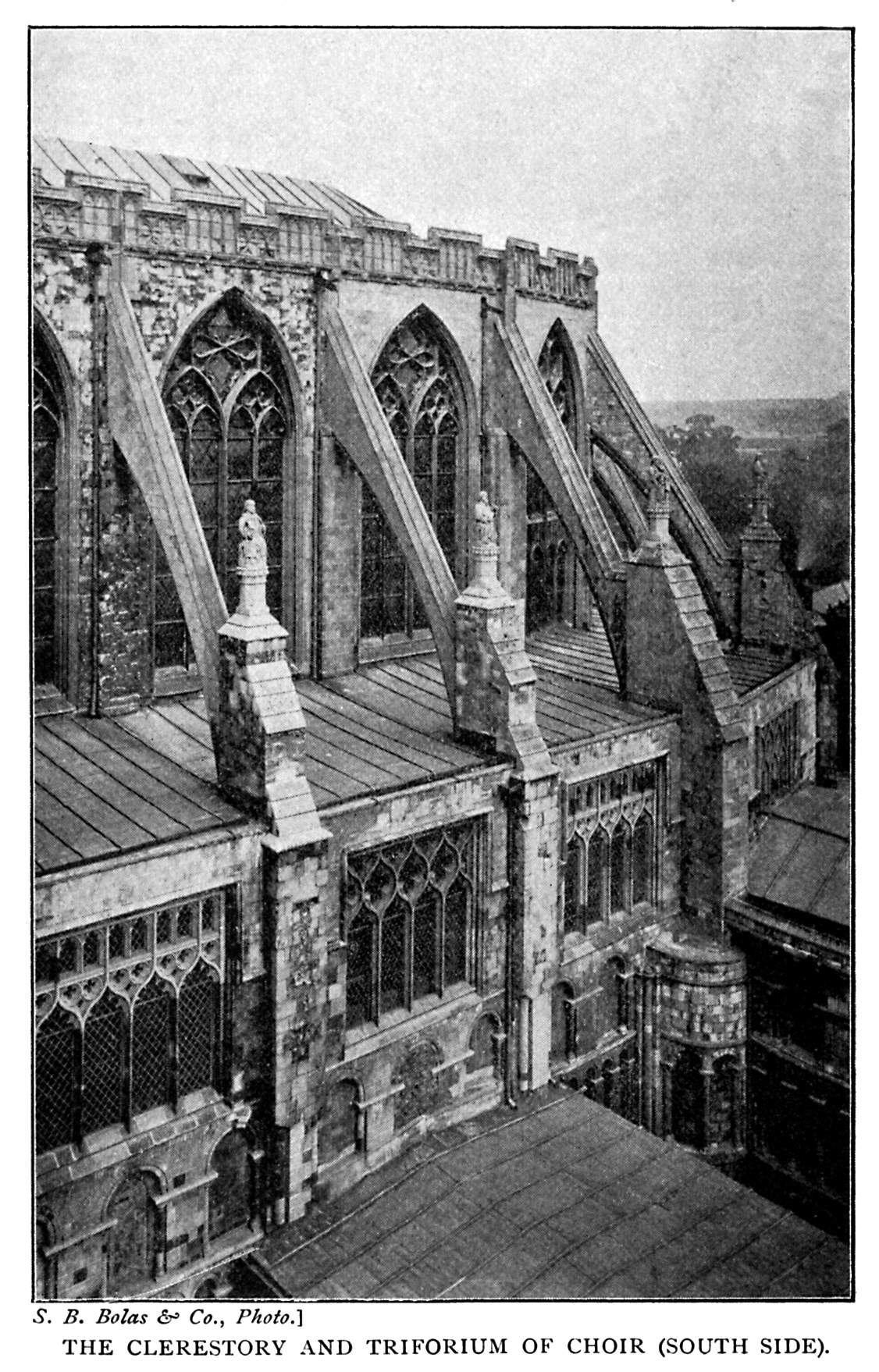 Bishop Lyhart left to his successor, Bishop Goldwell, in his will 2200 marks for repairing the dilapidations caused by the fire of 1463. During this bishop's episcopate we find that the cathedral was brought nearly to that state in which we have it now,—the tower was still further adorned with Perpendicular battlements, the presbytery was vaulted in with stone, and the flying-buttresses added around the eastern apse to take the consequent thrust of the new vault.