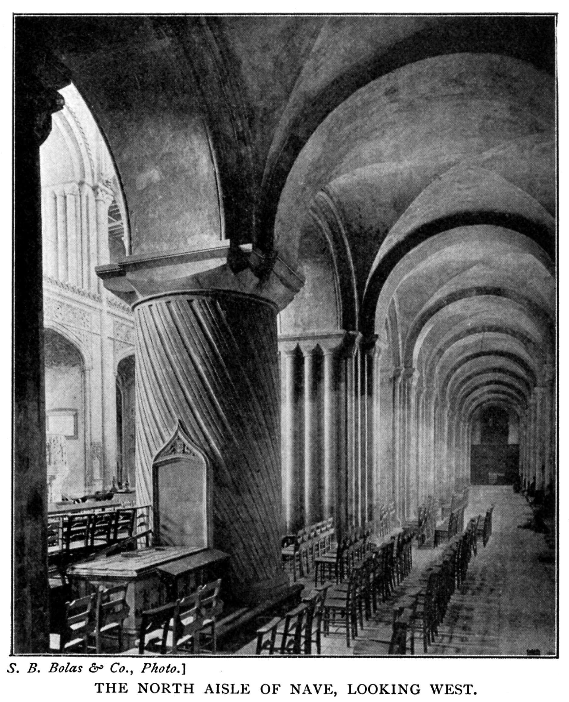 [11]Bishop Eborard, who succeeded in 1121, is credited with having finished the nave from the point where Herbert had left it. The evidence which goes to support this theory is taken from the Registrum Primum. "Moreover, the same Herbert completed the church of Norwich in his own time, as I have learned from the account of old people, but have not found in writing, as far as the altar of the Holy Cross, which is now called the altar of St. William. He also built all the episcopal dwelling-house, except the great hall." The altar referred to was on the north side of choir screen.