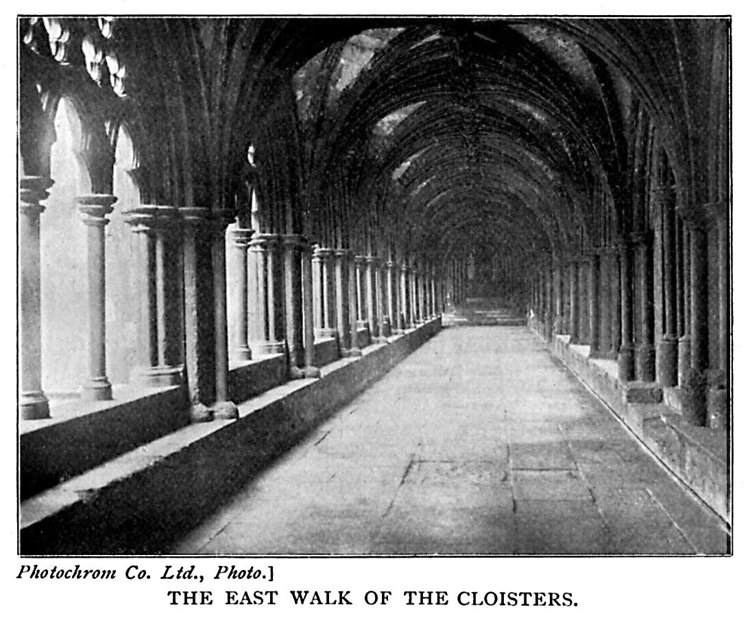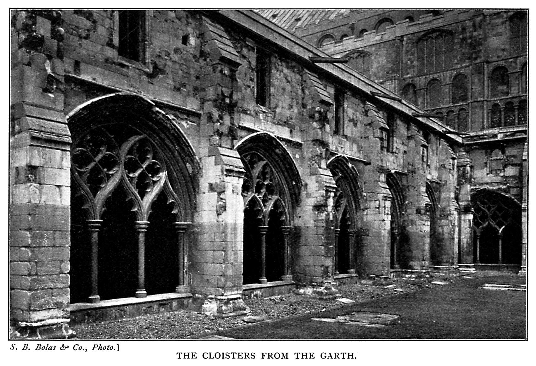 Bishop Roger de Skerning had died in retirement on the 22nd of January 1277, and in the meantime the work of reparation had proceeded with such vigour that on Advent Sunday 1278 his successor, Bishop Middleton, was inaugurated with great state; Edward I. and his Queen with the Bishops [15][16][17]of London, Hereford, and Waterford being present. He does not seem to have done much in the way of building, though the work of reparation was carried on; he died in 1287, and it was left to his successor, Bishop Ralph de Walpole, to begin the work of rebuilding the cloisters. The original Norman cloisters, which had endured until the time of the great fire in 1272, were probably of wood. It was determined to rebuild them in stone in the prevailing style. The cloisters are described in more detail in the notes on the interior of the cathedral, so that it will be sufficient to state here that their building spread over a period of one hundred and thirty-three years, and that they were finished during the episcopate of Bishop Alnwick.