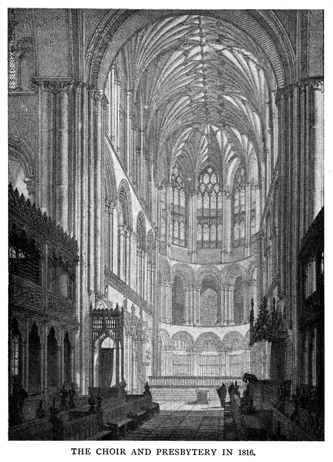 Continuing the history of the fabric, we can pass on to the episcopate of Bishop Percy, during which, about 1361, the wooden spire and parts of central tower of the cathedral were blown down by a violent gale of wind, and the presbytery was greatly damaged by the falling material. This bishop rebuilt the present clerestory, designed in the transitional style between Decorated and Perpendicular; the vault is later. It is also probable that he repaired the spire.
