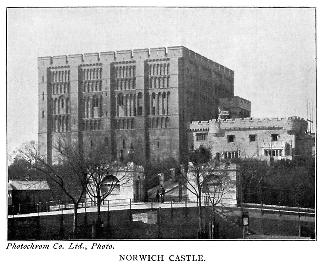 The visitor to this ancient city will by no means wish to confine his attention to the Cathedral and its precincts; but the space at our disposal will not permit more than a list of other monuments which are worthy of attention. Among these the Castle naturally comes first. Occupying the site of a very ancient—probably British—stronghold, the first building was erected in early Norman times. For many years it was the principal fortress of the Bigods, Earls of Norfolk, and under them experienced many vicissitudes of fortune at the hands of both Flemings and French. The last event of importance connected with it was the hanging of Kett in 1549. The keep is in dimensions 96 x 92 feet, its height being 72 feet (see p. 99).