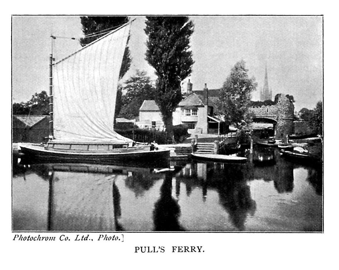 At Pull's Ferry the water-gate to the precincts is still standing. It is an interesting piece of flint work. The ferry itself, of which a view is given here, is a favourite sketching place.