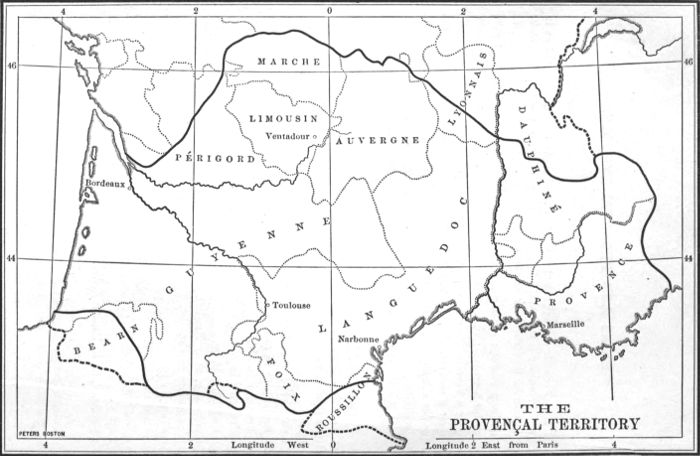 Readers desiring a brief description of Provençal literature are referred to H. Suchier and A. Birch-Hirschfeld, Geschichte der französischen Literatur, pp. 56-96; A. Stimming, in Gröber’s Grundriss der romanischen Philologie, II, ii, pp. 1-69; and A. Restori, Letteratura provenzale. For a more extended account of the poets they should consult Die Poesie der Troubadours and the Leben und Werke der Troubadours by F. Diez; and The Troubadours at Home by J. H. Smith. The poetic ideals are discussed by G. Paris in Romania, XII, pp. 516-34; and with great fulness by L. F. Mott in The System of Courtly Love. The beginnings of the literature are treated by A. Jeanroy in his Origines de la poésie lyrique en France au moyen âge, reviewed by G. Paris in a series of important articles in the Journal des Savants (November and December, 1891, and March and July, 1892) reprinted separately in 1892 under the same title as Jeanroy’s book. Contributions by A. Restori to several volumes of the Rivista musicale italiana deal with Provençal music; some tunes in modern notation are to be found in J. H. Smith’s Troubadours at Home, and in the Archiv für das Studium der neueren Sprachen, CX (New Series X), 110 (E. Bohn).[1] Aside from the editions of individual poets, the best collections of verses are those of C. Appel, Provenzalische Chrestomathie;[v] V. Crescini, Manualetto provenzale; and K. Bartsch, Chrestomathie provençale. Earlier and larger anthologies are M. Raynouard’s Choix des poésies originales des troubadours, and C. A. F. Mahn’s Werke der Troubadours and Gedichte der Troubadours. The only dictionary of importance for the old language is the Lexique roman (six volumes) of M. Raynouard, augmented by the Supplement-Wörterbuch of E. Levy (now appearing in instalments). The poetic language of the present day can be studied to advantage in E. Koschwitz’s Grammaire historique de la langue des Félibres.