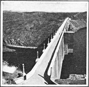 First among the imposing structures of the Service in the order of beginning and completion is the Roosevelt Dam, the important engineering feature of the Salt River project in Arizona. Brilliant and daring in its conception, diverse and complicated in its problems, and stupendous in its structural features, the Roosevelt Dam stands today an enduring monument to the creative genius of its designer and builder. The layman will not appreciate the complexity of the problems and the variety of obstacles that were encountered without an understanding of the locality in which the work was carried on. The dam is located in a region which was once regarded as almost inaccessible except to the nomadic Apache, who found a safe refuge here for many years. The nearest railway is 62 miles away. Twenty miles of this distance is across a waterless, parched and forbidding desert. For more than 40 miles the country, gashed and fissured into fantastic forms, a region of stupendous canyons, steep sided mountains, and turbulent streams, presented an almost insuperable barrier to ingress. It is a region of colorful and inspiring scenery, but most unpromising as a site for a large engineering work. The initial step was to build a highway to the dam-site, a task of much difficulty on account of the rough country and the unwillingness of white laborers to do the work. The road was finally completed, largely by utilizing the Apache Indians, many of whom were remnants of Geronimo’s band of marauders. The influence of this experiment in employing Indians has been of lasting benefit to the Red Men of the Southwest, many of whom have continued on similar work for railroads and other corporations. The Roosevelt Road, now familiarly known as the Apache trail, is one of the most spectacular highways in the country, and thousands of tourists go over it each year in automobiles.
