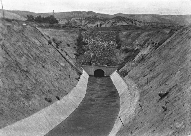 Connecting with the outlet of the tunnel is a large cement-lined canal which conveys the water to the valley ten miles below. Here it mingles with the Uncompahgre, and by means of a complex distribution system of canals and laterals, finally reaches the irrigable lands.
