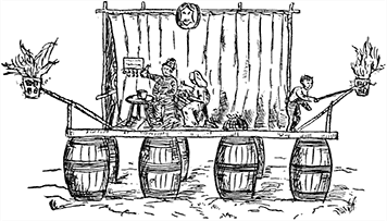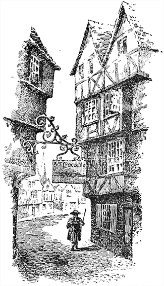 The proprietor himself, we are told, might have been forty-five years of age. “He was of middle height, his face was thin, his nose very much hooked, his eyes small and piercing, with[330] a good-humoured twinkle in them. His mouth was large and drawn down at one corner. He was stout in his body, and carried a considerable protuberance before him, which he was in the habit of patting with his left hand complacently. But although stout in his body, his legs were mere spindles, so that in his appearance he reminded you of some bird of the crane genus.