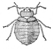 Another very prevalent belief among the old settlers in the West, that this insect normally lives on dead or diseased cottonwood logs, and is almost certain to abound in log houses of this wood, seems to be equally devoid of basis. As illustrating this belief, the department has on file a very definite report from an Army officer that the bedbug often occurs in numbers under the bark of dead cottonwood trees,[8] especially along the Big Horn and Little Horn Rivers in Montana. The basis of this report and the origin of this very general misconception is probably, as pointed out by the late Prof. Riley, due to a confusion of the bedbug with the immature stages of an entirely distinct insect,[9] which somewhat resembles the bedbug and often occurs under cottonwood bark.