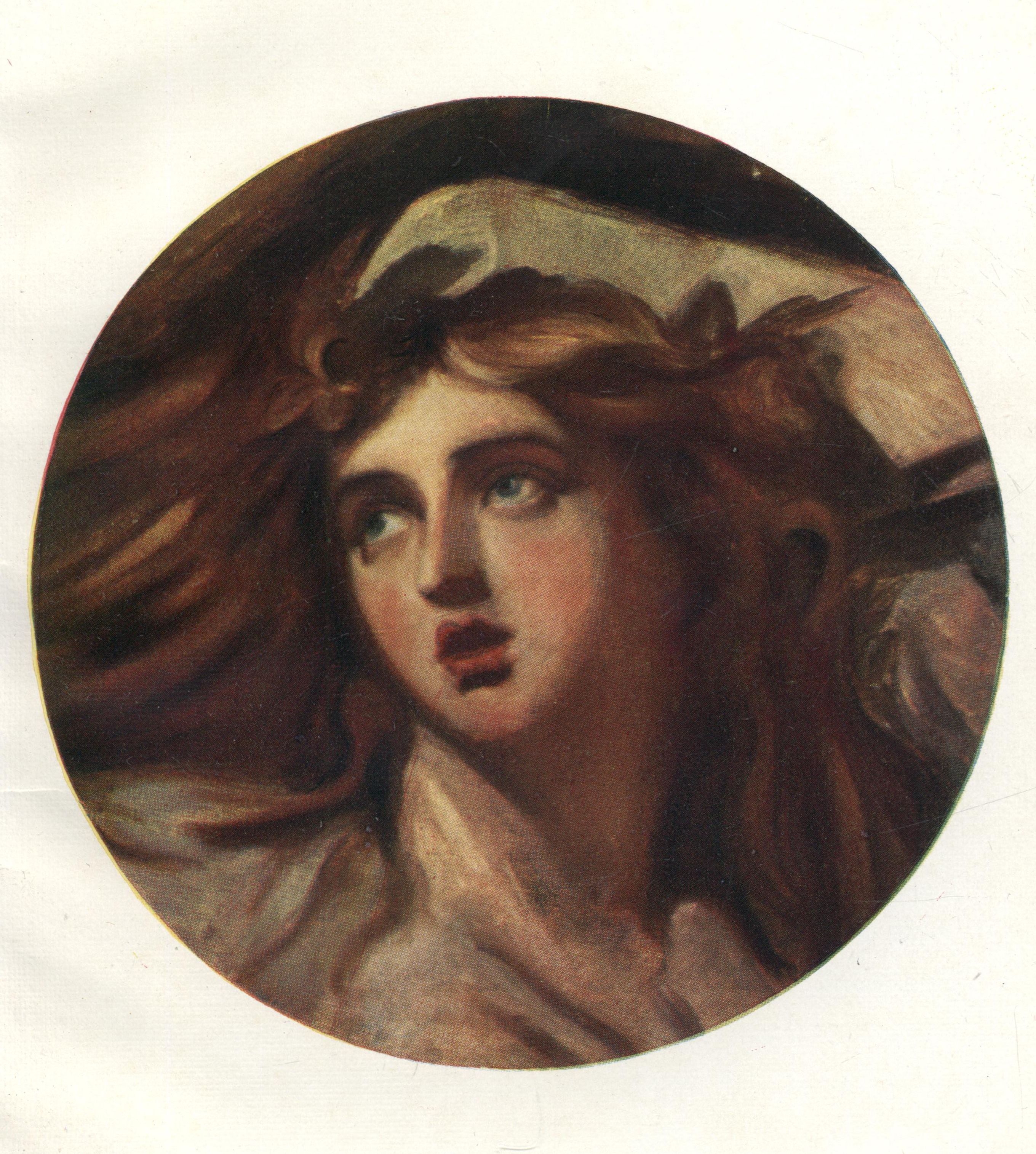 Her rich brown hair falls in tempestuous disorder over a pillow; the mouth is open; the eyes are as near to tragedy as the volatile Emma could go. This sketch (circular, 1 ft. 6 in.) was presented to the National Gallery in 1898.