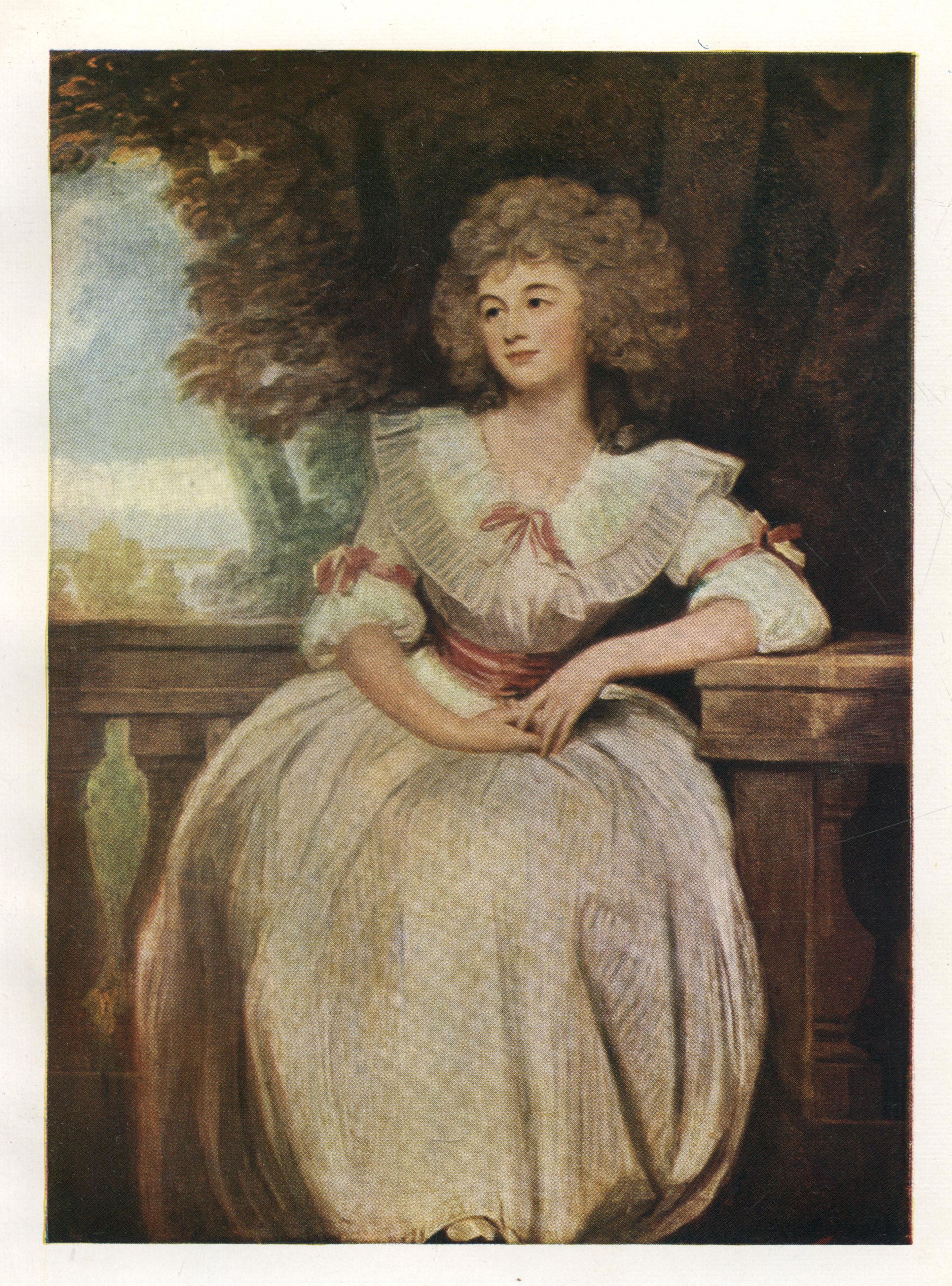 Mrs. Mark Currie sits demurely self-conscious, as his quick eyes saw her in the first impressionistic glance, artfully clad in a simple muslin dress, relieved by the pale crimson sash and the ribbons of the same colour that nestle in fichu and sleeves. The fair hair is powdered; the large eyes gaze from the soft oval face conscious of, and content with, its comeliness; the landscape is sufficiently reminiscent of nature to harmonise with the pretty artificiality of the contented little lady who left Duke Street, Bloomsbury, to sit in the studio of "the man in Cavendish Square" on May 7, 14, 25, July 1, 9, 22, of the year 1789. "Paid for," continues the extract from the Diaries in the Catalogue Raisonné "in full by Mr. Currie, December 1790, £63; sent home June 20, 1791."