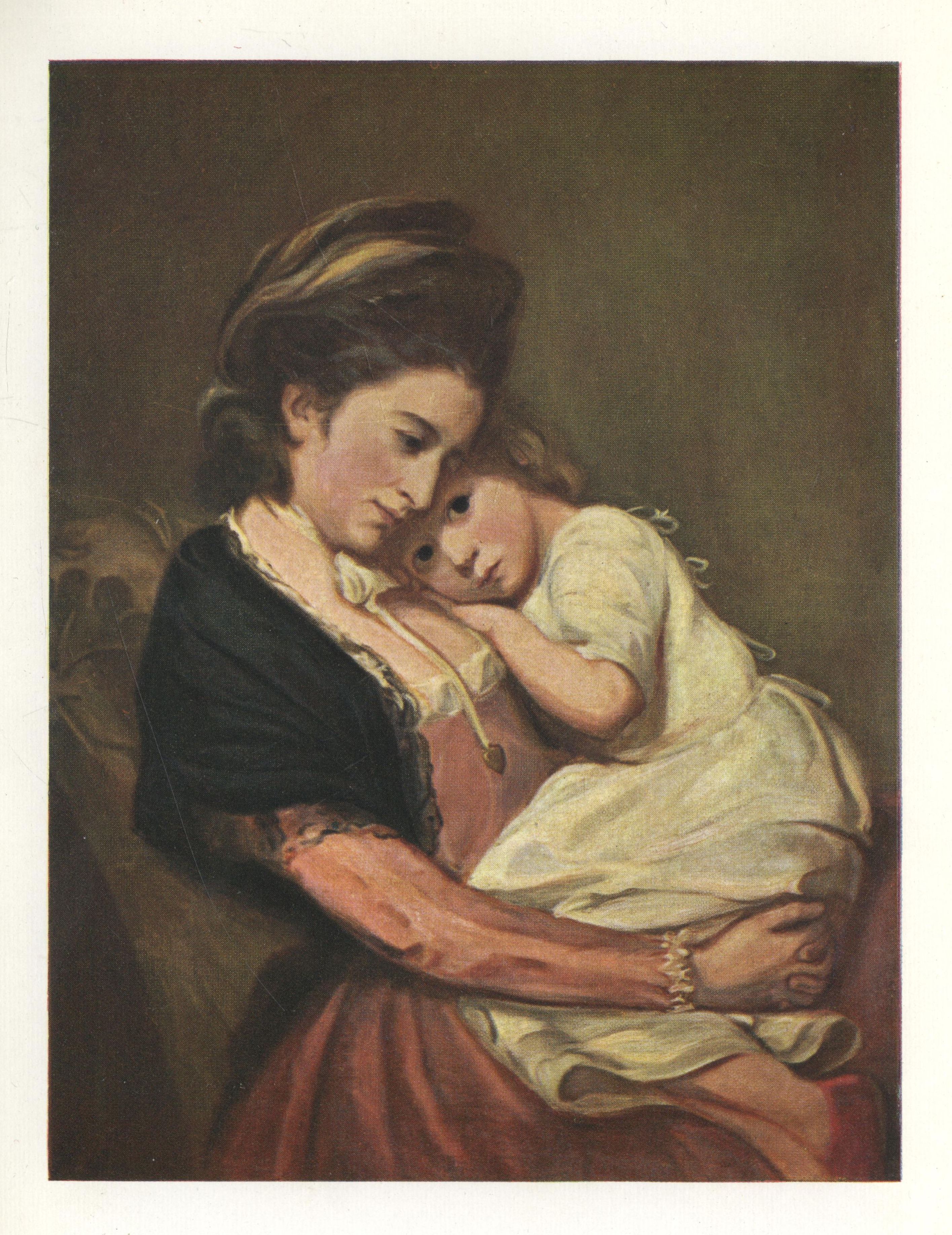 A few of his "Mother and Child" groups must also have place on the walls of my imaginary room—the "Mrs. Russell," in a green dress at Swallowfield Park, holding the sash of her small child, who is standing upon a table, back to the spectator, regarding its chubby face in a circular mirror—a happy design this, most natural and winning; the "Mrs. Canning," seated beneath a tree and clasping her infant to her bosom, but quite conscious that her portrait is being painted; and the "Mrs. Carwardine," in a high white cap, who is consoling her baby and ignoring the painter—a charming and restful group.