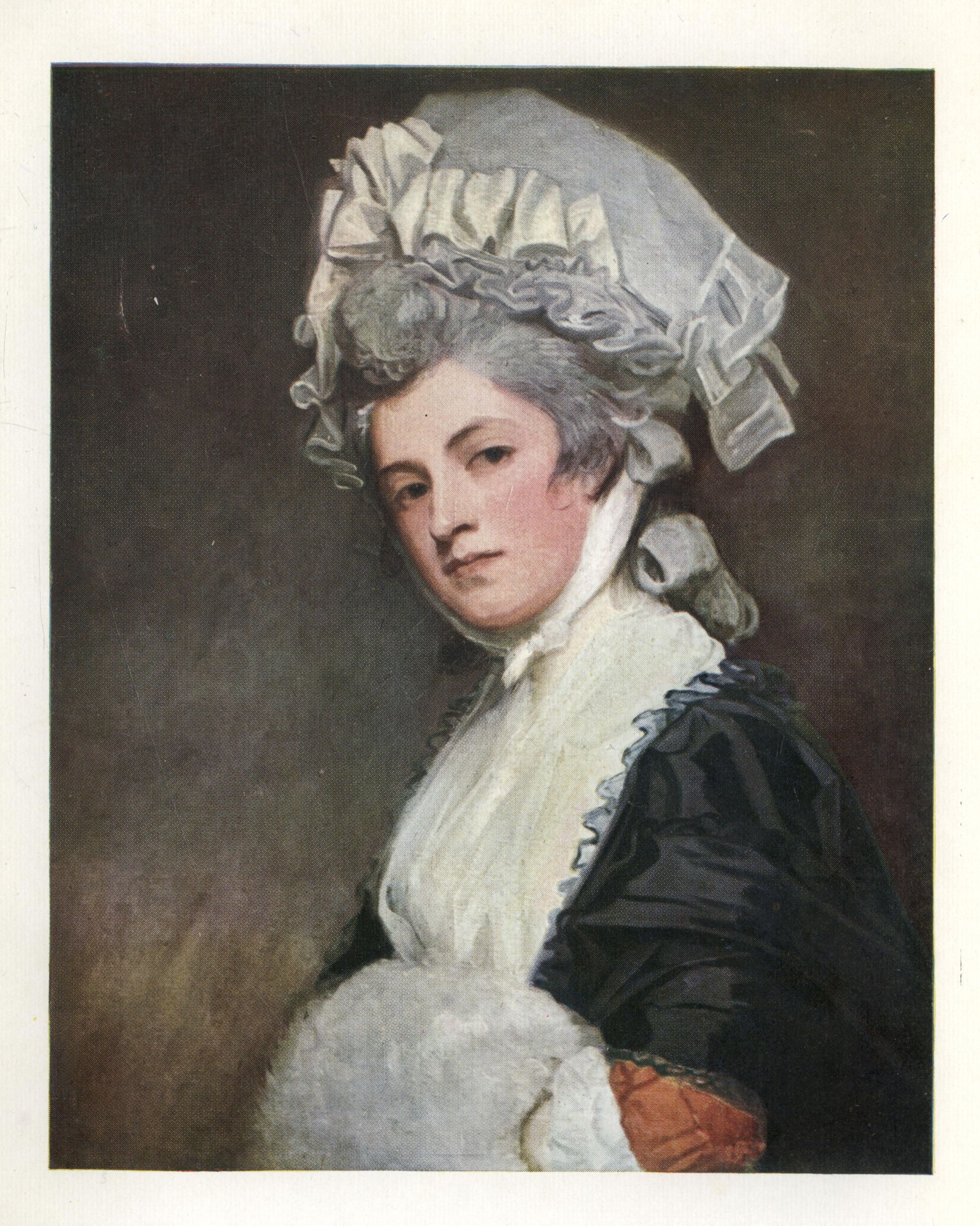 It was through Romney's influence that a delightful change towards simplicity and slight and delicate colours was made in the feminine fashions of his day, for he persuaded some of his sitters to discard the ugly, long-waisted bodices in favour of the simple white gown and fichu that Mrs. Mark Currie wears.