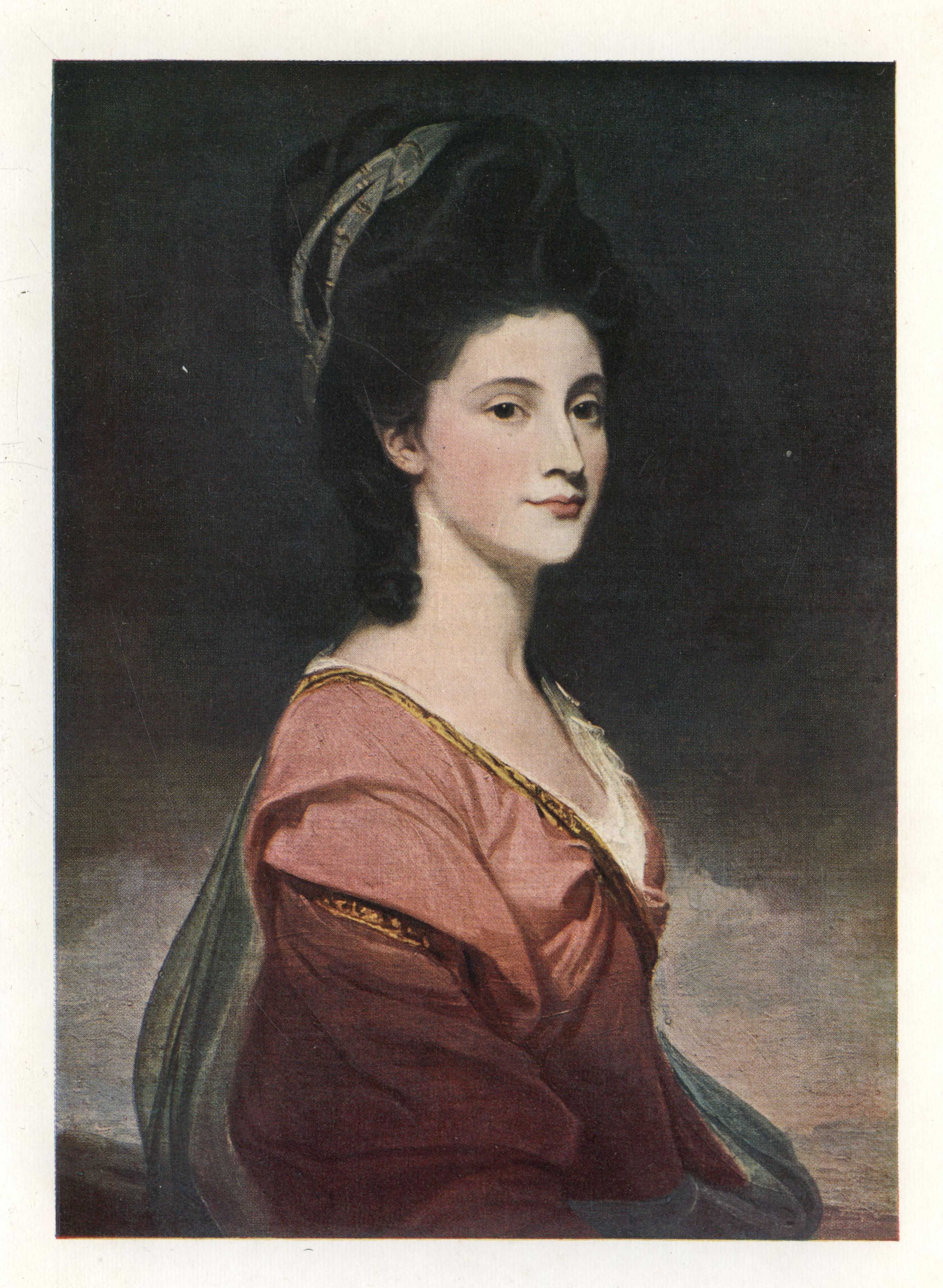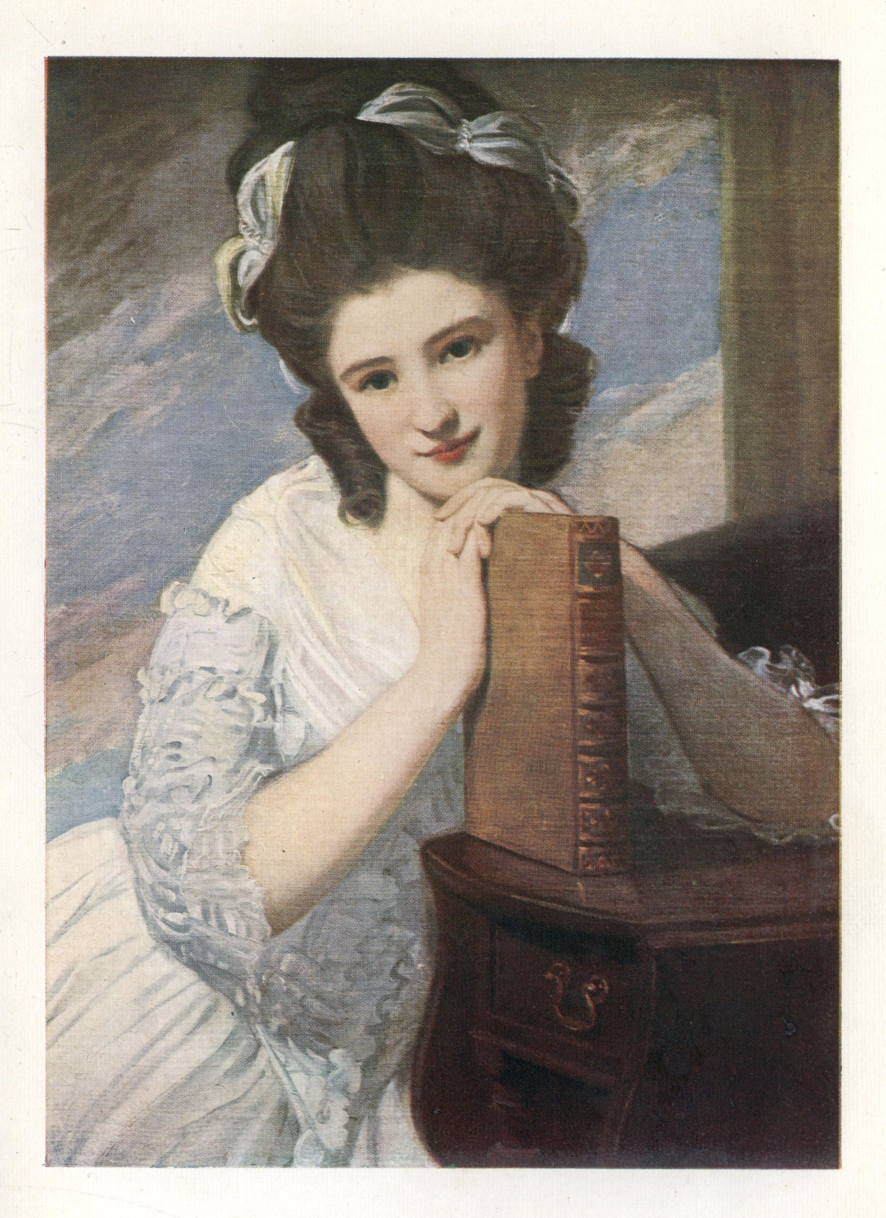 The younger of the beautiful Ramus girls, who afterwards became Lady Day. Miss Benedetta of the lovely eyes, that languish and sparkle as if pleading against oblivion, rests her hands upon a book in reverie. This beautiful girl and her sister were also painted by Gainsborough. That lovely work was most unfortunately destroyed by fire.