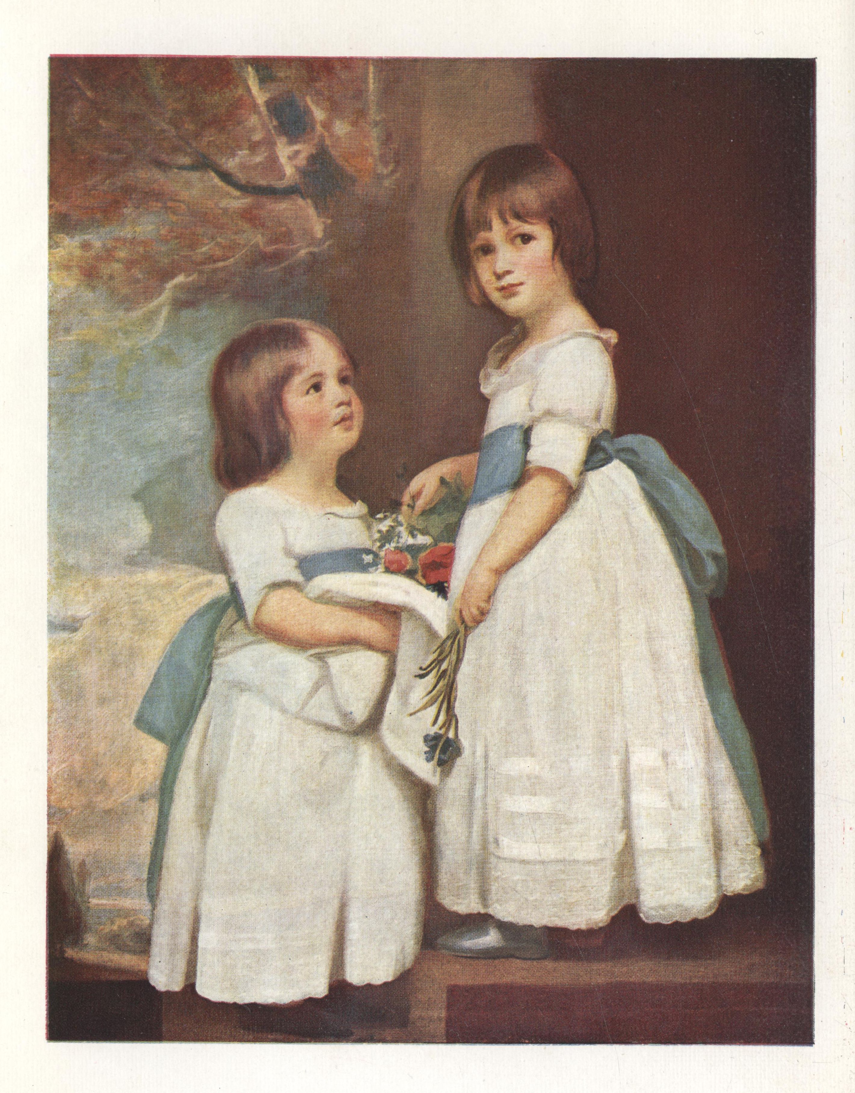 The group of "The Horsley Children," so simply painted and so sure, was designed on one of Romney's happy days. George and Charlotte stand on the steps of a garden terrace beneath a tree, in white dresses with blue sashes. In her right hand the girl holds poppies; in her left a corn-flower.