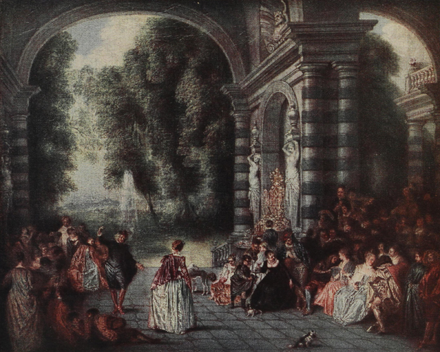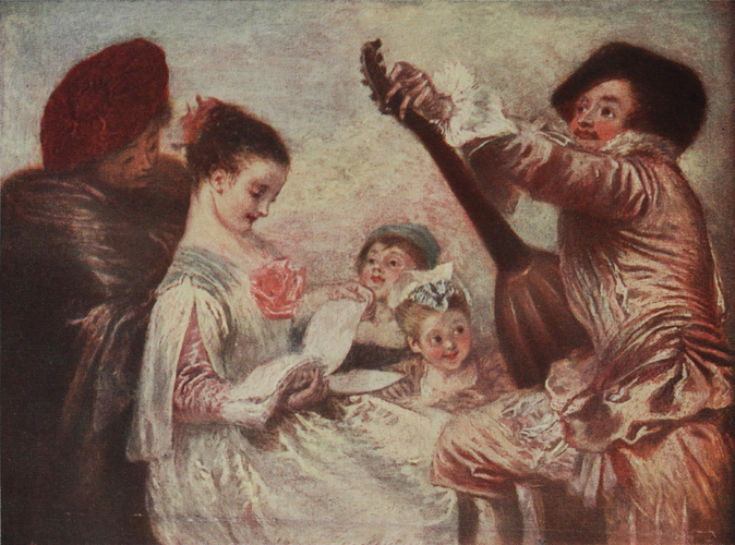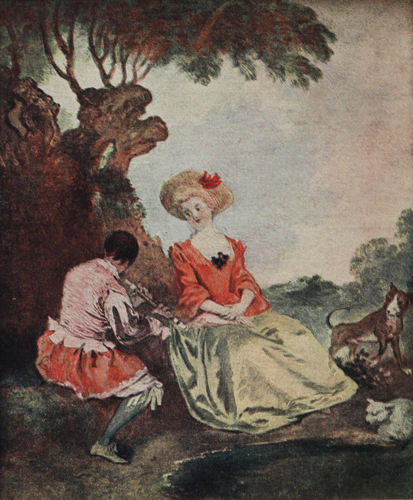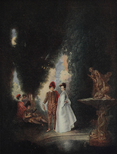 From Titian Watteau borrowed warmth,[Pg 55] and from Veronese coolness of colour; Gillot, the decorative painter, showed him his own inherent power; Audran, too, helped him, and the Luxembourg Gardens and Gallery aided his artistic development.