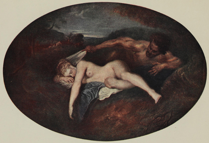 "Jupiter and Antiope" at the Louvre suggests Titian and Rubens filtered through Watteau. This nude studied from life, not painted from his drawings, is more laboured than his other pictures, but the loss of spontaneity in the colour is compensated by the truth and beauty of the abandon of the beautiful limbs in repose. Brown Jupiter, blonde Venus—no attenuation of the truth here—lights loaded, browns rich, with pearly reflections on the fair skin.