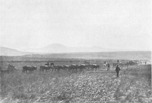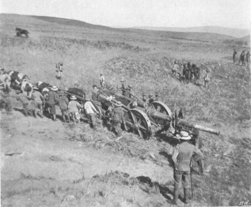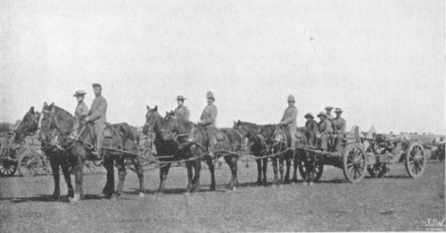 In the evening orders suddenly came for Limpus' battery of 4.7's, my two 12-pounders, and Richards' four 12-pounders to advance the next morning (12th) at 4 a.m. to Chieveley, some seven miles from the Boer lines; and here again I was in luck's way as being one of the fortunates ordered to the front. All was now bustle and hurry to get away, and eventually the line of Naval guns, some two miles long with ammunition and baggage wagons, moved out in the gray of morning over the hills, with an escort of Irish Fusiliers, who looked very smart, "wearin' of the green" in their helmets.
