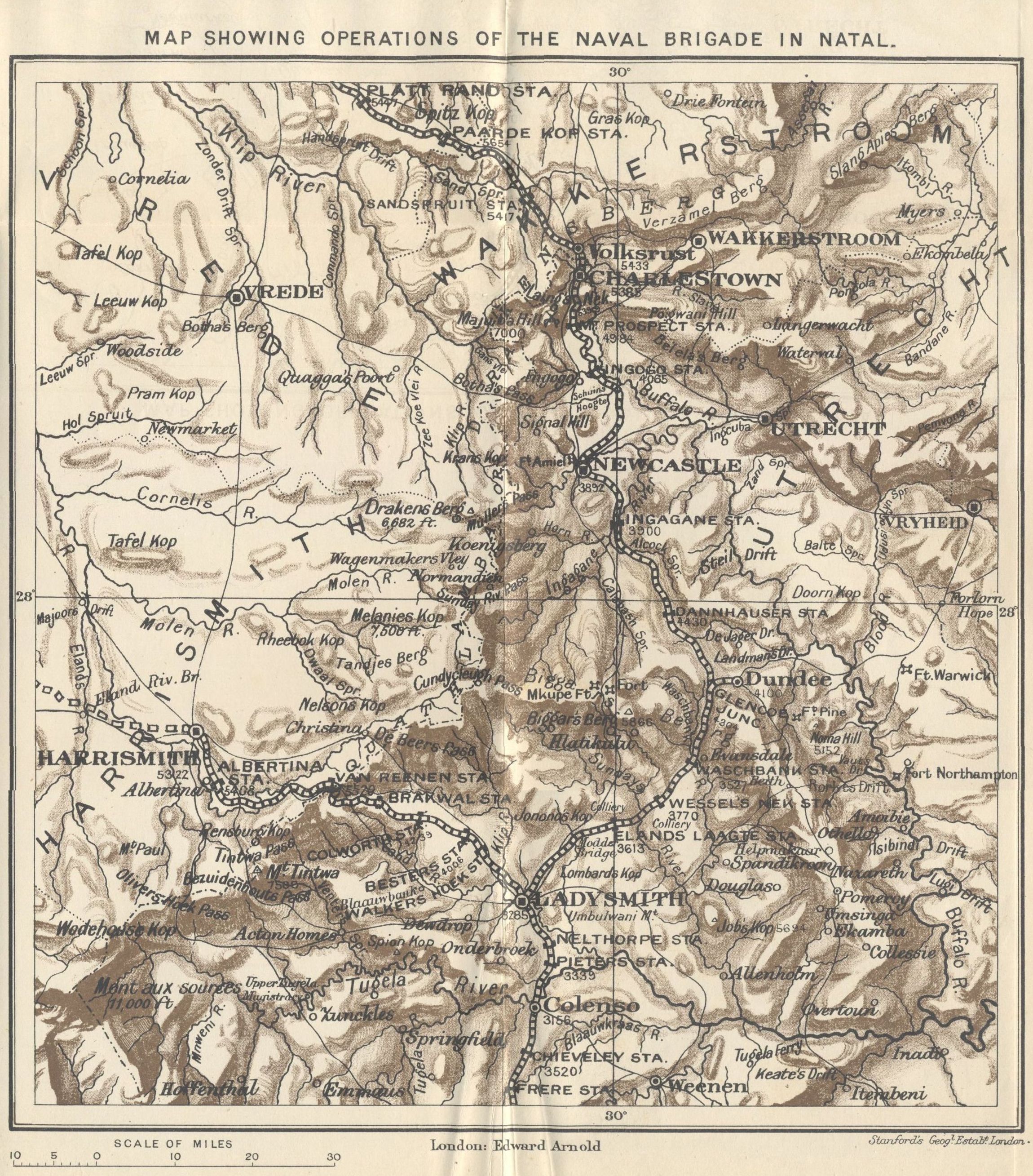 Eventually I got off by train next morning (9th) for Frere, Captain Reeves, R.S.O., of the Buffs, who did me many kindnesses later on, having secured a compartment for me in a carriage which was shunted for the night, and in which I was very comfortable, although disturbed by continuous shuntings of various trains and carriages which made one realize how much work was falling on the railway officials and employés. In our train were fifty Natal Naval Volunteers under Lieutenants Anderton and Chiazzari. I was much struck with their good appearance and their silent work in stowing their gear in the train, and I realized their worth all the more when they joined up later on with our Brigade; all staid, oldish men, full of go and well dressed, while their officers were very capable, with a complete knowledge of the country.