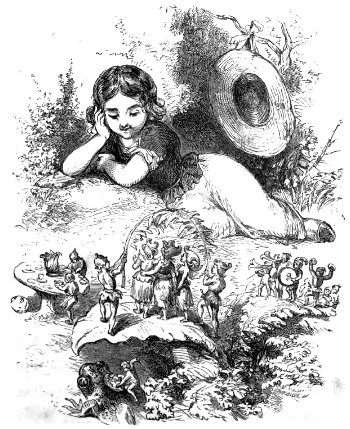 "Some blossoms from the elder bush, little ivory urns, served them for goblets. These were set upon a mushroom, and some red clover blossoms were rolled around the table for seats. The little men had tried in vain to break these blossoms off; so they caught a caterpillar, whipped him along with grass blades, and made him use his teeth for a knife. Then they had caught a toad, and heaped his round back with the blossoms, which rolled off as fast as they could be picked up again; and by the time they reached their mistresses, the fairy servants were warm and red in the face as any hay makers.