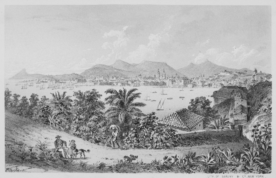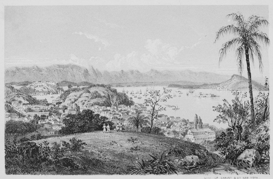 November 30th.—We bade adieu to Constantia on the morning of the 26th inst. It was not yet sunrise when we took leave of our host for the ride of forty miles through the mountains to this place. We set off in the following order; first, a sumpter-mule, with our luggage and provender for the day, led by a negro on foot; then a courier, the counterpart in age, size, and blackness, of our guide from San Aliexo, but a perfect dandy in comparison, in his costume—being dressed in a trimly-fitted jacket and trowsers of new nankeen, a highly polished castor hat with 412velvet band and broad rim, beneath which was worn, in Brazilian style, a scarlet silk handkerchief, floating loosely down the shoulders behind; leggings of untanned leather, so wide at the top as to serve for the reception and safe carriage of all kinds of small packages and parcels, but terminating in bare feet well-spurred; the Padre, as I am styled, and his mule came next; while the fleet-surgeon, last in position, but first in height and dignity, brought up the rear. I was quite impressed with the appearance of respectability in our departure, by the long line thus formed, till, at the outer gate, it was suddenly shorn of its “proportions” by the loss of our footman, who, tying the halter of the beast he was leading, firmly into the long hair of the tail of our little courier’s mule, gave us his benediction and returned to the house.