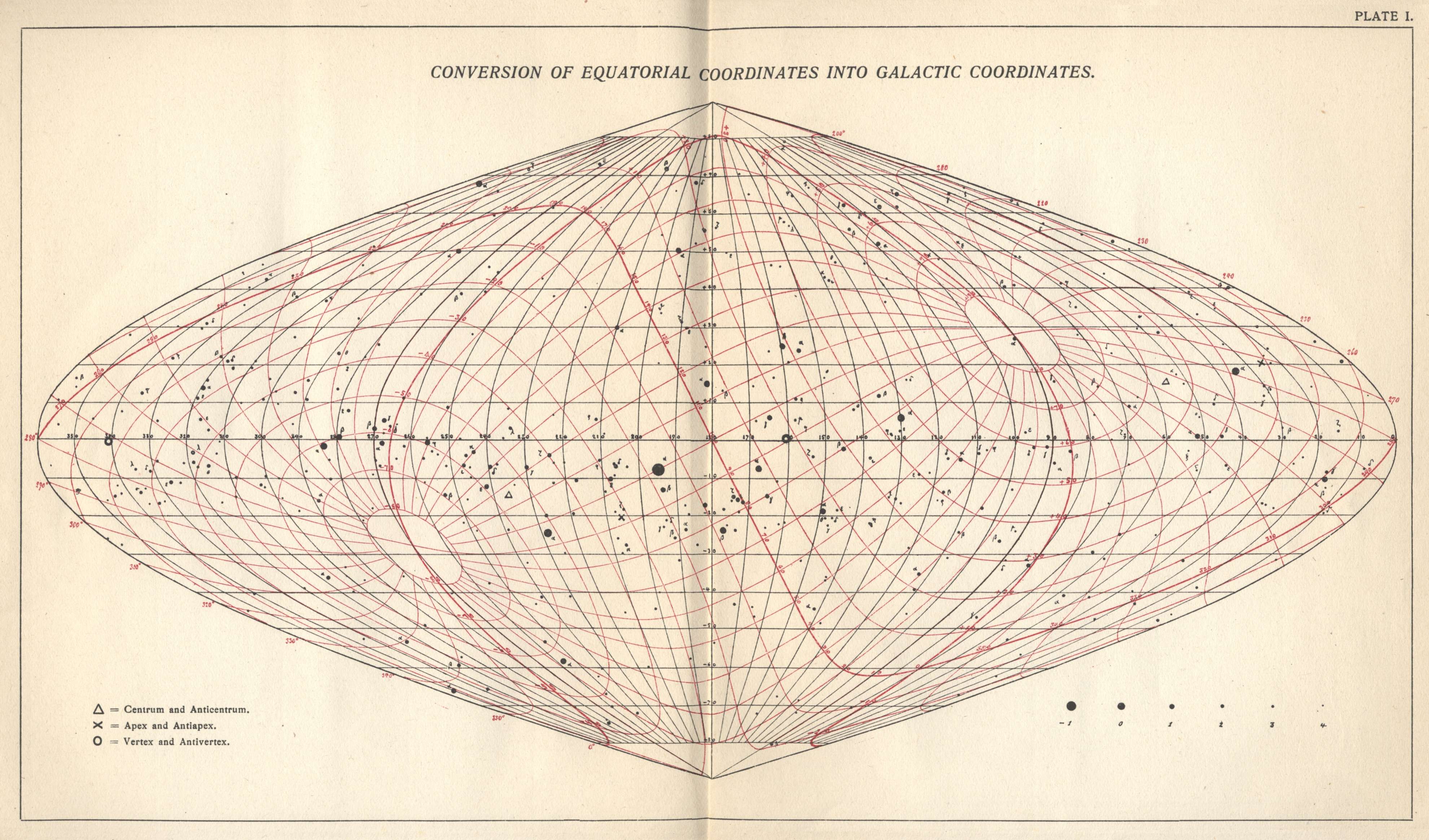 The galactic longitude (l) is reckoned from the ascending node of the Milky Way on the equator, which is situated in the constellation Aquila. The galactic latitude (b) gives the angular distance of the star from the Galaxy. On plate I, at the end of these lectures, will be found a fairly detailed diagram from which the conversion of α and δ of a star into l and b may be easily performed. All stars having an apparent magnitude brighter than 4m are directly drawn.