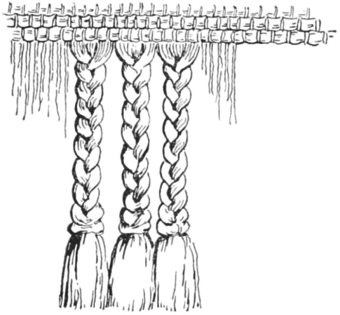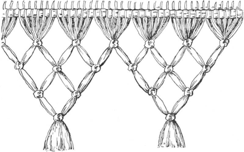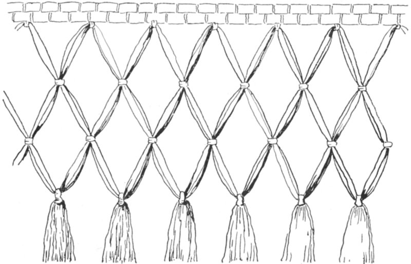 When woven, the rug should measure three feet by six, without the fringe. This is to be knotted, allowing six threads to a knot. This kind of bath-rug—which is the simplest thing possible in weaving—will be found to be truly valuable, both for use and effect. If the filling is sufficiently heavy, and especially if it is made of half-worn rags, it will be soft to the feet, and can be as easily washed as a white counterpane; in fact, it can be thrown on the grass in a heavy shower and allowed to wash and bleach itself.