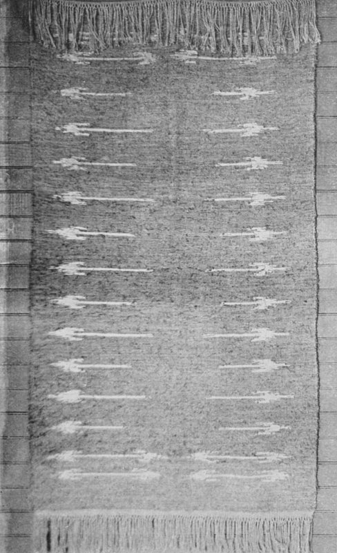 There is an extremely good style of rag rug made at Isle Lamotte, in Vermont,[38] where very dark blue or green woolen rags are woven upon a white warp, with a design of arrows in white at regular intervals at the sides. This design is made by turning back the filling at a given point and introducing a piece of white filling, which in turn is turned back when the length needed for the design is woven and another dark one introduced, each one to be turned back at the necessary place and taken up in the next row. Of course, while the design is in progress one must use several pieces of filling in each row of weaving.
