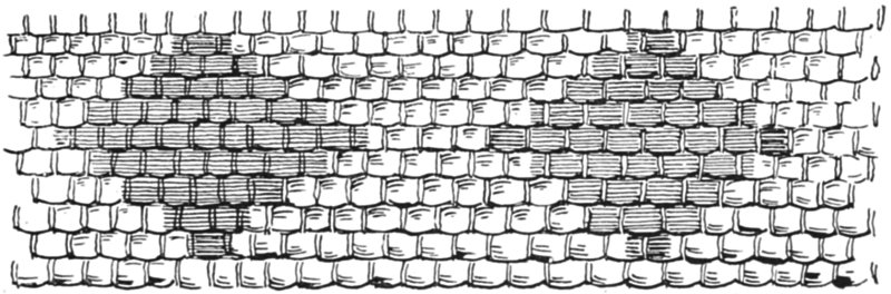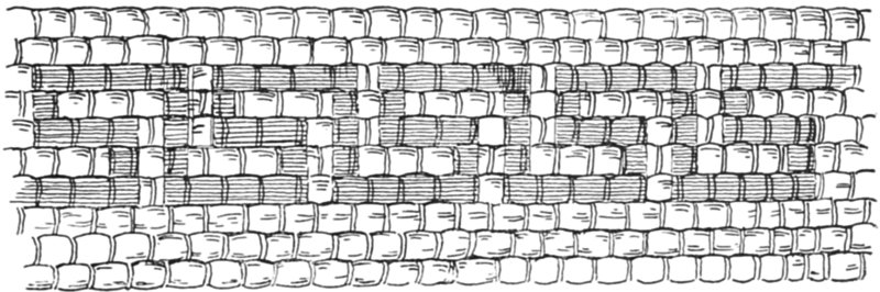 The border can be made brighter, as well as firmer and stiffer, by using two filling threads together—a red and a black; or an alternate use of red and black, using two shuttles, will give a lighter and better[91] effect than when black is used exclusively.