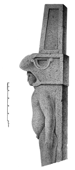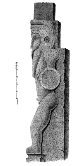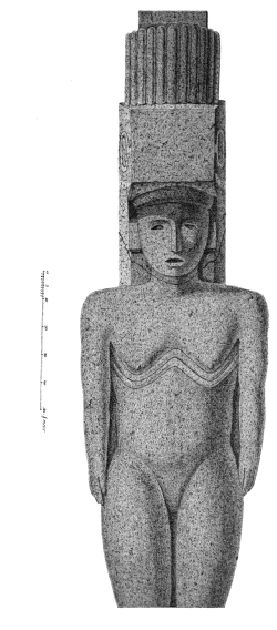 Female, standing figure, its head slightly bent forwards, and its arms hanging straight down. It was found erect, but imbedded in the earth to [Pg 16] the navel; the head was broken off, but was found close to the statue. The statue was very well sculptured, but not so carefully finished as the preceding one. The forehead was adorned with a low turban or round band, upon which was placed the heavy capital, with carvings in relief on the sides. The capital was surmounted by the square-shaped tenon, the lower part of which was surrounded by twenty staves with rounded tips. These ornaments seem to indicate, that in this statue, as well as in the former one, which was adorned with a double frame, the lower part of the tenon has been visible, and only its uppermost portion inserted into the plate of the building. The face and chest were well preserved, although not so accurately rendered as in A. The mouth was half-open, the eyes were well marked, deep cut, the ears hidden by large, square, flat, and grooved pieces. The breasts were held up by a double, round band. The breadth across the shoulders was extraordinarily great. The shoulders were high and thin, the arms very short and feeble in proportion to the body, not entirely detached, but much more so than in A. The length of the statue from the upper edge of the tenon to the knee was 226 cm., the breadth across the shoulders 66 cm.; the length of the tenon 34 cm.