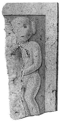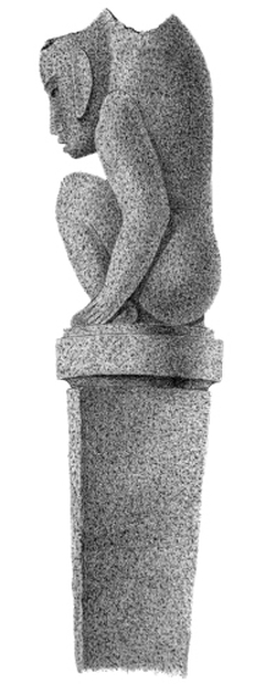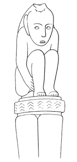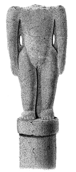 Male, half-sitting figure, with straight hanging arms; of considerably less size than A and B, and very badly damaged. The head and neck were broken off, and crushed into small fragments, impossible to reconstruct. The pedestal was round, column-shaped, without any ornaments. The figure had powerful arms, detached from the sides of the body. The legs were unusually thick and strong, the feet clumsy, with thick, short toes. In the middle of the chest there was a carved oval, with a little circle in its centre. The length of the statue from the shoulder to the sole of the foot was 110 cm., the breadth across the shoulders 56 cm.