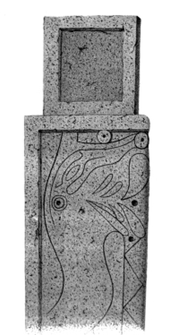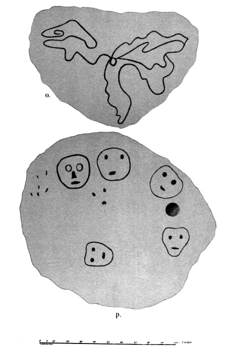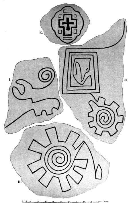 It was situated due S. of mound 2, and held rather the same dimensions, but it was less symmetrical in form. Near it only R and R 1, two large stone-slabs, lids, or parts of a wall, ornamented with human figures in high-relief, were found. [Pg 22]