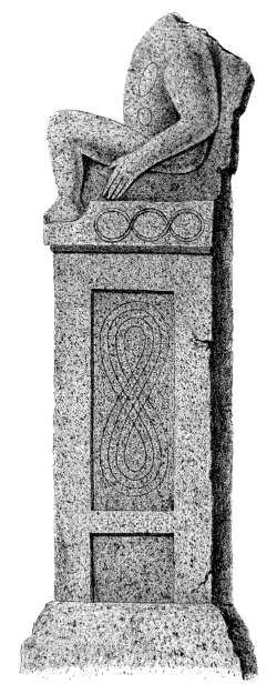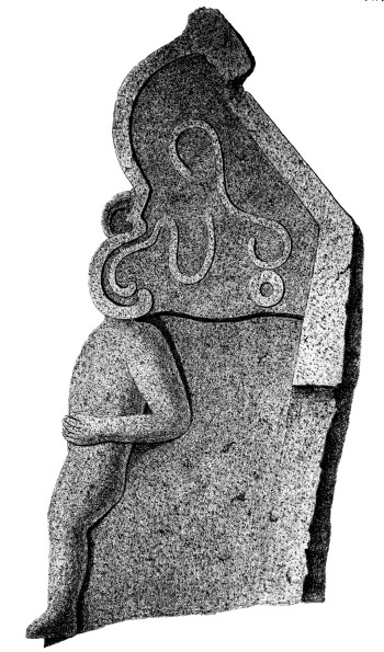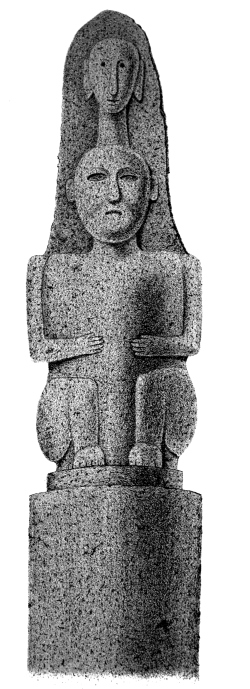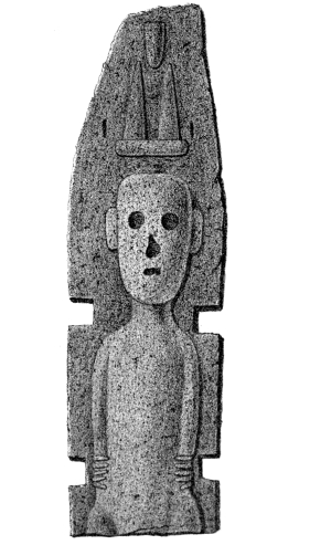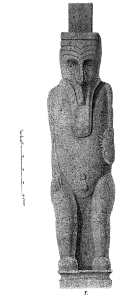 Male, half-sitting figure, with its right arm hanging straight down, and its left one bent, and resting on the chest. According to my impression, received on regarding the statue and sketching it, it represented a chieftain or warrior with a mask before his face and a helmet on his head. I have arrived at this conclusion from the reasons, viz. that the face was here incomparably much stiffer than in the other images, without the slightest attempt of indicating the muscles, the [Pg 20] cheeks, or the mouth; further that the eyes were marked by two concentric circles with a little (peeping-)hole in the centre, and that the whole face and the covering of the head were so much broader proportionally to the breadth of the body than in the other statues. (A somewhat similar head was found on the heavily injured statue at the mound 5.) The head-cover may be considered to exhibit the form of a helmet; this reached to the shoulders at both sides, hiding the ears completely; but nearly at the place of the ears there was on each side a shallow circular depression with a small excavation, probably representing a hole, in the centre. From the lower part of the helmet a thick elevation, grooved length-wise in front, came down over the chest. It may be regarded as representing a breast-armour, or possibly a beard. From the face itself, below the nose, a piece of the same shape as the just described elevation was seen to descend, but it was of much smaller dimensions. The left shoulder with the bent arm was somewhat more raised than the right. Both shoulders were uncommonly large and broad, so that the artist almost seems to have intended to indicate the blade-bone. The arms were pressed close to the body, disproportionately narrow when viewed from the front, but more than sufficiently broad when viewed from the side. On its left bent fore-arm the statue held a little round shield, at the anterior margin of which the hand projected, showing, unusually enough, the thumb of the same length with the index. The chest and abdomen were sculptured with some signs of muscles. The legs were short and thick, the feet clumsy, with no traces of toes. The image stood on a pedestal, the upper part of which showed a deep cavetto. The pedestal was deeply immersed into the ground. Immediately above the helmet was the square tenon. The length of the statue from the upper edge of the tenon to the upper edge of the pedestal was 207 cm. The breadth across the shoulders was 57 cm., that of the head 36 cm. The statue was on the whole well preserved, and stood, no doubt, in its original situation.