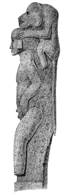 Male, standing, much damaged. The human figure supported on his head the head of a massive animal of the feline genus, by its form most reminding one of the African or Persian lion(!). The statue was thrown down and broken in several pieces; only the head of the animal was so far preserved as to enable one to discern something of the original sculpture. Upon this head was part of a square tenon. The length of the statue from the upper edge of the forehead to the thighs was 84 cm., the breadth across the shoulders 39 cm., the length of the face 24 cm. The head of the animal was 54 cm. high and 52 cm broad.
