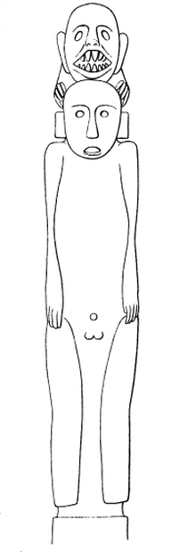 This statue, a double figure, was dug up out of the ground between the mounds 1 and 2. It has probably stood free, because considerable portions of its back were well elaborated. It is quite evident, that it [Pg 23] has not served to support a roof, as the upper part of the head of the upper figure wanted every trace of a tenon, and was carefully finished. It represented a male figure, somewhat stooping, with bent arms, the hands leaning on the hips. Upon this human figure that of an animal was seated, embracing with its fore-paws the head of the male figure. The animal was probably intended to represent a monkey. The male figure had an ugly face, with a long straight nose; the eyes were formed by quite circular cavities, the mouth was widely open, and the chin very short. The ears were covered by thick, square, flat pieces, as in the image B. The neck was long, the shoulders were much raised, large and powerful; the arms were bent, pressed close to the sides of the body, very narrow when seen from the front, broad and flat when seen side-ways. The chest and stomach were pretty roughly worked; the muscles however were sharply marked. The legs were short, without any trace of muscles or even of knees. The feet were completely wanting, the legs being abruptly cut off. The second figure, the monkey, rested its lower jaw upon the head of the principal figure, clasping the hind part of it with its long fingers. The head was large, with prominent muzzle and jaws, low, curved forehead, and broad nose, with round nostrils. The hanging ears were long and broad, rounded backwards. The mouth was open, showing strong, sharp teeth. The fore-legs or arms were very long, the fore-arm was bent at a right angle to the upper arm, the shoulder-blades were very broad and powerful. The back was strongly curved inwards, the tail long, longer than the animal itself, hanging straight down. The hind legs were short, strongly bent, drawn up towards the abdomen, and abruptly cut off above the feet, as in the principal figure. The length of the statue from the top of the animal’s head to the upper edge of the pedestal was 175 cm. The breadth of the human figure across the shoulders was 31 cm.; the breadth of the monkey across the shoulders was 21 cm.