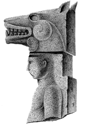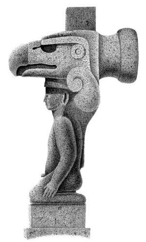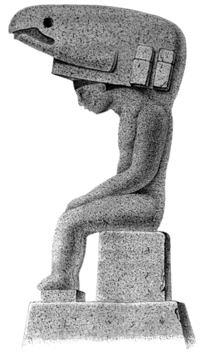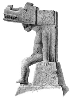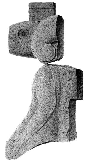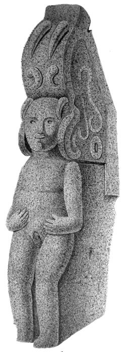 Male, kneeling figure, supporting the head of a great vulture or «Rey de Zopilotes». It belonged to the same category as H, but has probably stood isolated, as the back was as neatly cut as the front. The head of the vulture was colossal in proportion to the human figure supporting it, and very carefully sculptured. The beak was very true to nature, the eye formed a semi-circular cavity, the anterior corner of the eye was well indicated. Backwards projected a massive round process, a sort of crest on the back of the head. On the top of the head was a tenon-shaped projection, which, however, could hardly have served the purpose of a tenon, as it was unusually thin in comparison with the tenons found on the statues around the mound 1. It may possibly have been designed to represent the comb of the beak of the vulture, though [Pg 26] in such a case it was placed too far backwards. The anterior part of the head and the cheeks were carved with softness and elegance. Behind the head of the human figure the head of the vulture was united to its support by a snailshaped spiral (volute) with wide aperture. Although the kneeling male figure was not perhaps so well worked as the image H, yet it was well balanced, and of an easy posture. The forehead was straight, the nose slightly curved, the mouth closed, the lower lip thin, prominent; the cheeks were rather thin, the ears disproportionately large, and placed too far backwards. The neck was long, the Adam’s apple was indicated on the throat. The chest was rather little developed, the shoulders and upper arms vigorous, the hands pressed against the sides of the legs. The male organ was placed high up on the abdomen. The legs below the knees were of equal thickness throughout, without any trace of muscles, smoothly rounded backwards, without feet. The pedestal being broken, the statue was thrown down in the middle of the «plaza», the open place or square between the mounds 1, 2, 3 and 4. The length of the vulture’s head from the anterior edge of the beak to the posterior edge of the process at the back of the head was 100 cm., the height of the head from the top to the inferior edge of the lower jaw 37 cm. The whole length of the statue from the upper edge of the tenon-shaped projection to the upper edge of the pedestal was 154 cm. The upper part of the pedestal formed a square plinth, on which the human figure was kneeling.