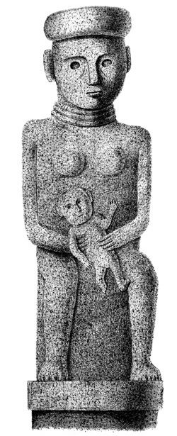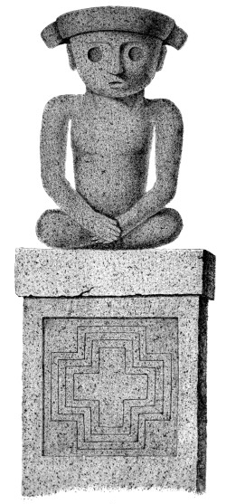 Punta del Sapote forms a broad, rounded peninsula, the greatest length of which is in N.E. and S.W. Its middle part is a large plateau, about 150 m. high, sloping rapidly both towards the lake and the neck of the peninsula, and thus forming an isolated height of somewhat more than one kilometer in length by scarcely one kilometer in breadth. The central portion of this plateau is perfectly level and, judging by the numerous statues met with here, and the regular form of the stone-mounds, round which they were placed, appears to have been a sacred place during the Niquiran period. On the very isthmus between the peninsula and the island of Zapatera rose a conical stone-structure, 30-40 m. high; it consisted of enormous, unhewn blocks, placed upon one another in pretty regular layers. Its diameter at the base might be estimated at about 40 m. The top of the cone was truncated, and appeared to form a plane of 6-8 m. in diameter. The steep sides were so densely covered by spinous bushes and lians, that I was soon obliged to desist from my attempts to mount the summit. The whole structure resembled a kind of beacon, and has possibly been a place of sacrifice, although its dimensions were so large, that it cannot well be regarded as such a «sacrificial pillar» as is mentioned by Peter Martyr under the name of «Tezarit». Maybe a little «casita» has stood on the platform above. Something of the same kind is known from Uxmal.