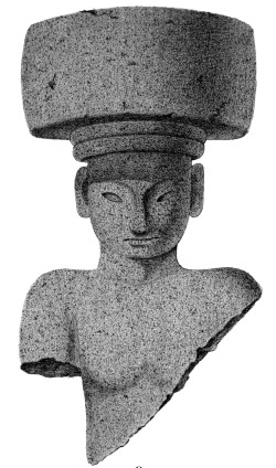 Female, sitting with straight arms, the hands pressed against the stone seat in a posture just able to sustain the pressure of a heavy load. The head was wanting, but the well marked posture, as compared with that of the just described figure, seems to justify the conclusion that [Pg 29] this figure has also supported upon its head the large head of some animal. The entire figure was heavy and clumsy, but the circumstance of the muscles of the body being indicated both in front and behind, makes it not improbable that this statue has stood insulated, like K. The arms were quite detached from the body, and uncommonly thick and heavy, as were also the legs. The hands were heavily pressed against the block, on which the figure was seated, the right hand with the palm, the left one with the knuckles. The most remarkable feature of this statue was perhaps the bench on which it was seated; this was cut out from the block so as to be quite free and detached. The statue, like all above described ones, was sculptured from a single block, a monolith. The height of the statue from the shoulders to the upper edge of the pedestal was 107 cm. The breadth across the shoulders was 69 cm. It was found pretty close to the mound 4.