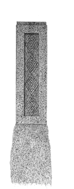 Contrary to the other images of this mound, indeed, of this whole locality, it did not represent a human figure, but formed a square pillar, provided with carvings on its front side. It carried a narrower superstructure (tenon), bordered in front by a sharp-cut frame, 6 cm. broad, 3 cm. deep. The carvings on the front side of the pillar itself consisted of wreaths somewhat more than 2 cm. deep with a breadth varying from 3 to 5 cm. They appeared to represent the head of an animal with an eye surrounded by two concentric circles. The sides of the pillar were narrower, smooth, without any traces of wreaths, but bordered by a square-cut frame, 6 cm. broad and 3 cm. deep. The back of the pillar, which was turned towards the building, was rough, without any frame. The front side was provided with a frame only above, and along the eastern side. The front side of the pillar was 50 cm. broad, the lateral sides 37 cm. broad. The tenon was 40 cm. in height by 38 cm. in breadth. The pillar was so deeply imbedded in the ground, that in spite of our digging strenuously, I did not succeed to lay bare more than about 125 cm. of its length, reckoned from the upper edge of the tenon. [Pg 19]