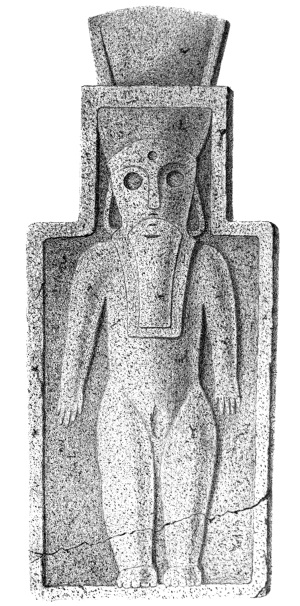 Male, standing figure. This statue did not belong to the same category with H, I and K, but had probably served as support in the wall of a building, because the turban-shaped head-dress was surmounted by a tenon, and the back was not elaborated. It had suffered so much from the violence of human hands, and from the effects of the climate, that its outlines could hardly be distinguished. From the upper edge of the tenon to the thighs it measured 123 cm. The length of the face was 24 cm. It was found immediately north of the mound 6.
