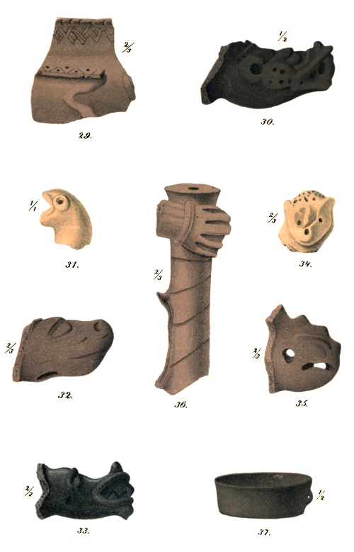 19. Pl. 35. Fragment of the side of a larger bowl or tinacca, with a figure in relief, representing a monkey’s arm; terra cotta; painted with a red-brown colour. Zapatera, Punta del Sapote.