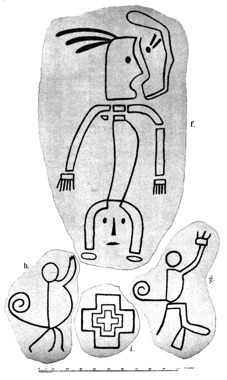 It was of the same kind as G, i. e. representing a human figure, on whose shoulders and head an animal was seated. It was much damaged, and [Pg 24] almost impossible to delineate. The anterior portion of the animal’s head was crushed, as were also the legs and arms of the human image, whose face seemed designed to represent a skull with a long neck. The face of the principal figure was 21 cm. long. The length of the animal from the crown of the head to the root of the tail was 50 cm. The legs and claws of this animal were larger than those of the monkey in G.