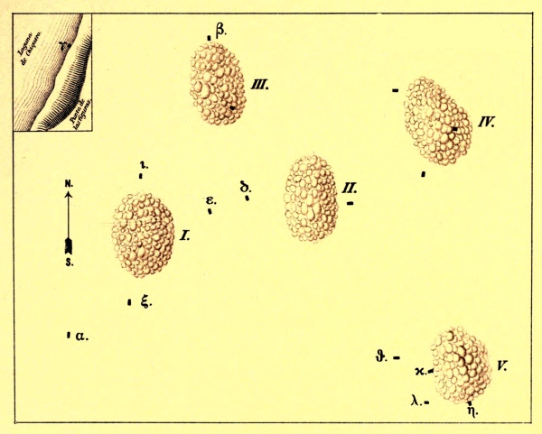 Due north of this cone, on the top of the above mentioned plateau, were six stone-mounds of oval form, but of very different size. The largest [Pg 14] (Pl. 41: 1) measured about fifty m. in length by thirty m. in breadth, the smallest (Pl. 41: 6) about fifteen m. in length by somewhat less than half in breadth. The greatest diameter of each mound was in N. and S. The stones of these mounds varied of course in size, but for the most part they were large, more or less cubical, from half a meter to one meter long and about half a meter broad. Their often regular shape and pretty plane sides, particularly in the mound 1, might lead one to infer that some of them have been hewn, and have formed the foundations and possibly also the walls of buildings, the ground plans of which are indicated by the form of the mounds and the situation of the statues, of which we are soon going to speak.
