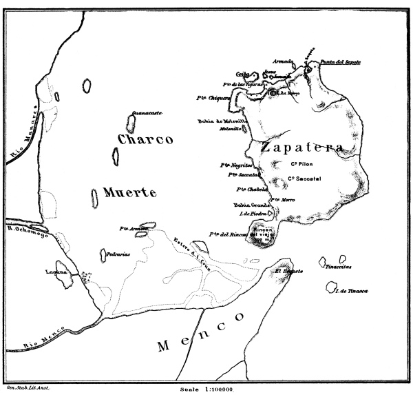 I stayed in this charming double-island for more than a month, roving through it on horse-back and on foot in all directions, ascending the volcano, rowing and sailing over the delightful lagoons and bays, that border its shores, and amongst which I shall late forget that very paradise for the hunter, Laguna de Santa Rosa and Charco Verde. Having left Ometepec about the beginning of February, my next visit was to «tierra firme», where I made some easily executed, but not very successful excavations, immediately to the north of San Jorge. From Departemento de Rivas’ I sailed to Las Isletas, also called Los Corales, an extremely beautiful little archipelago, just southwards of Granada. The whole group owes its existence to the volcano Mombacho, which towers high above it, the islands consisting exclusively of the remains of one or more eruptions of Mombacho. But the vegetation here is so powerful and luxuriant, that it has changed those piles of black [Pg 11] stones into smiling islands, which the traveller is never tired of admiring. Only on the outside of the archipelago, where the often angry lake of Nicaragua has checked the development of the verdant cover, the black, gloomy basalt is still open to the view, lashed by white-foaming waves. In several of the islets statues were measured and delineated, but unfortunately the photographic apparatus could not be used on this occasion. After a stay of some days among Las Isletas and a short visit to Granada for the purpose of completing my photographic outfit, I set sail for Zapatera. On my arrival I encamped for a long time on the playa of Bahia de Chiquero. Along the playa of the semi-circular bay there are now five houses, the homes of as many families, being the only inhabitants at the present time of this large and fertile island, which was, no doubt, formerly populated by many thousands of Niquirans, possessing rich towns and splendid temples. The islet of Ceiba is situated off Bahia de Chiquero (see map 2). According to my opinion, Zapatera is certainly a volcanic island, but in this manner, that its north-western part is the summit of a sunken volcanic cone, Bahia de Chiquero being the crater itself, the narrow, elevated mountain ridge which surrounds the bay, forming the edge of the crater and the islet of Ceiba the continuation of this edge, Laguna de Apoyo, situated scarcely one kilometer from the shore, may then be regarded as a side-crater.