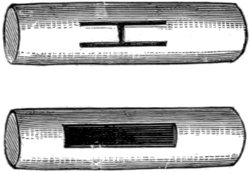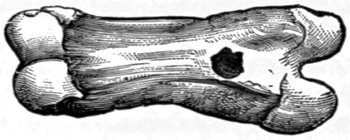 A musical relic has recently been exhumed in the department of Dordogne in France, which was constructed in an age when the fauna of France included the reindeer, the rhinoceros, and the mammoth, the hyæna, the bear, and the cave-lion. It is a small bone somewhat less than two inches in length, in which is a hole, evidently bored by means of one of the little flint knives which men used before acquaintance with the employment of metal for tools and weapons. Many of these flints were found in the same place with the bones. Only about half a dozen of the bones, of which a considerable number have been exhumed, possess the artificial hole. We give a woodcut of one of them.