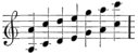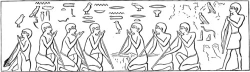 A flute-concert is painted on one of the tombs in the pyramids of Gizeh and dates, according to Lepsius, from an age earlier than B.C. 2000. Eight musicians (as seen in the woodcut) are performing on flutes. Three of them, one behind the other, are kneeling and holding their flutes in exactly the same manner. Facing these are three others, in a precisely similar position. A seventh is sitting on the ground to the left of the six, 13 with his back turned towards them, but also in the act of blowing his flute, like the others. An eighth is standing at the right side of the group with his face turned towards them, holding his flute before him with both hands, as if he were going to put it to his mouth, or had just left off playing. He is clothed, while the others have only a narrow girdle round their loins. Perhaps he is the director of this singular band, or the solo performer who is waiting for the termination of the tutti before renewing his part of the performance. The division of the players into two sets, facing each other, suggests the possibility that the instruments were classed somewhat like the first and second violins, or the flauto primo and flauto secondo of our orchestras. The occasional employment of the interval of the third, or the fifth, as accompaniment to the melody, is not unusual even with nations less advanced in music than were the ancient Egyptians.