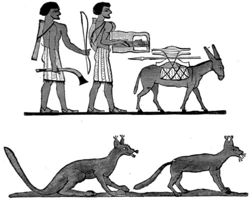 There appears to be a probability that a Hebrew lyre of the time of Joseph (about 1700 B.C.) is represented on an ancient Egyptian painting discovered in a tomb at Beni Hassan,—which is the name of certain grottoes on the eastern bank of the Nile. Sir Gardner Wilkinson, in his “Manners and Customs of the Ancient Egyptians,” observes: “If, when we become better acquainted with the interpretation of hieroglyphics, the ‘Strangers’ at Beni Hassan should prove to be the arrival of Jacob’s family in Egypt, we may examine the Jewish lyre drawn by an Egyptian artist. That this event took place about the period when the inmate of the tomb lived is highly probable—at least, if I am correct in considering Osirtasen I. to be the Pharaoh the patron of Joseph; and it remains for us to decide whether the disagreement in the number of persons here introduced—thirty-seven being written over them in hieroglyphics—is a sufficient objection to their identity. It will not be foreign to the present subject to introduce those figures which are curious, if only considered as illustrative of ancient customs at that early period, and which will be looked upon with unbounded interest should they ever be found to refer to the Jews. The first figure is an Egyptian scribe, who presents an account of their arrival to a person seated, the owner of the tomb, and one of the principal officers of the reigning Pharaoh. The next, also an Egyptian, ushers them into his presence; and two advance bringing presents, the wild goat or ibex and the gazelle, the productions of their country. Four men, carrying bows and clubs, follow, leading an ass on which two children are placed in panniers, accompanied by a boy and four women; and, last of all, another ass laden, and two men—one holding a bow and club, the other a lyre, which he plays with 22 a plectrum. All the men have beards, contrary to the custom of the Egyptians, but very general in the East at that period, and noticed as a peculiarity of foreign uncivilized nations throughout their sculptures. The men have sandals, the women a sort of boot reaching to the ankle—both which were worn by many Asiatic people. The lyre is rude, and differs in form from those generally used in Egypt.” In the engraving the lyre-player, another man, and some strange animals from this group, are represented.