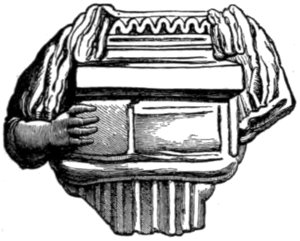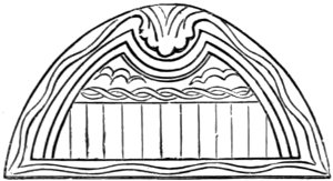 The instrument of the Trigonon species was held horizontally, and was twanged with a rather long plectrum slightly bent at the end at which it was held by the performer. It is of frequent occurrence on the bas-reliefs. A number of them appear to have been generally played together. At any rate, we find almost invariably on the monuments two together, evidently implying “more than one,” “a number.” The left hand of the performer seems to have been occupied in checking the vibration of the strings when its discontinuance was required. From the position of the strings the performer could not have struck them as those of the dulcimer are struck. If he did not twang them, he may have drawn the plectrum across them. Indeed, for twanging, a short plectrum would have been more practical, considering that the strings are placed horizontally one above the other at regular distances. It is therefore by no means improbable that we have here a rude prototype of the violin bow.