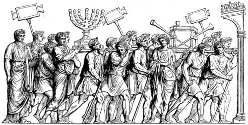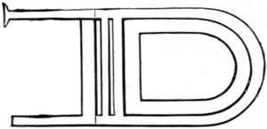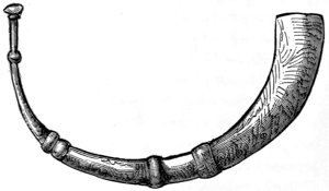 The Trumpet. Three kinds are mentioned in the Bible, viz. the keren, the shophar, and the chatzozerah. The first two were more or less curved and might properly be considered as horns. Most commentators are of opinion that the keren—made of ram’s horn—was almost identical with the shophar, the only difference being that the latter was more curved than the former. The shophar is especially remarkable as being the only Hebrew musical instrument which has been preserved to the present day in the religious services of the Jews. It is still blown in the synagogue, as in time of old, at the Jewish new-year’s festival, according to the command of Moses (Numb. xxix. I). The chatzozerah was a straight trumpet, about two feet in length, and was sometimes made of silver. Two of these straight trumpets are shown in the famous triumphal procession after the fall of Jerusalem on the arch of Titus, engraved on the next page.