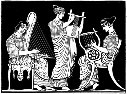 We know at present little more of these instruments than that they were in use in Greece. Of the Magadis it is even not satisfactorily ascertained whether it was a stringed or a wind instrument. The other three are known to have been stringed instruments. But they cannot have been anything like such universal favourites as the lyre, because this instrument and perhaps the trigonon are 28 almost the only stringed instruments represented in the Greek paintings on pottery and other monumental records. If, as might perhaps be suggested, their taste for beauty of form induced the Greeks to represent the elegant lyre in preference to other stringed instruments, we might at least expect to meet with the harp; an instrument which equals if it does not surpass the lyre in elegance of form.