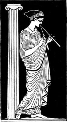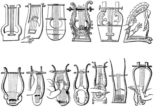 The Lyre occurs in three different forms, and is held horizontally 18 in playing, or at least nearly so. Its front bar was generally either oblique or slightly curved. The strings were tied round the bar so as to allow of their being pushed upwards or downwards. In the former case the tension of the strings increases, and the notes become therefore higher; on the other hand, if the strings are pushed lower down the pitch of the notes must become deeper. The lyre was played with a small plectrum as well as with the fingers.