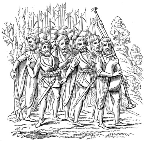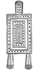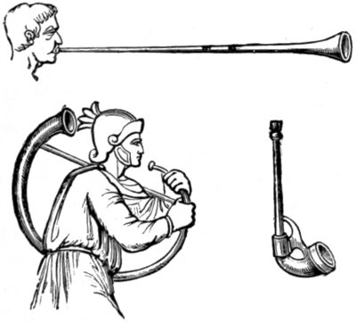 The Bagpipe. The word sumphonia, which occurs in the book of Daniel, is, by Forkel and others, supposed to denote a bagpipe. It is remarkable that at the present day the bagpipe is called by the Italian peasantry Zampogna. Another Hebrew instrument, the magrepha, generally described as an organ, was more likely only a kind of bagpipe. The magrepha is not mentioned in the Bible but is described in the Talmud. In tract Erachin it is recorded to have been a powerful organ which stood in the temple at Jerusalem, and consisted of a case or wind-chest, with ten holes, containing ten pipes. Each pipe was capable of emitting ten different sounds, by means of finger-holes or some similar contrivance: thus one hundred different sounds could be produced on this instrument. Further, the magrepha is said to have been provided with two pairs of bellows and with ten keys, by means of which it was played with the fingers. Its tone was, according to the Rabbinic accounts, so loud that it could be heard at an incredibly long distance from the temple. Authorities so widely differ that we must leave it uncertain whether the much-lauded magrepha was a bagpipe, an organ, or a kettle-drum. Of the real nature of the Hebrew bagpipe perhaps some idea may be formed from a syrinx with bellows, which has been found represented 24 on one of the ancient terra-cottas excavated in Tarsus, Asia-minor, some years since, and here engraved. These remains are believed to be about 2000 years old, judging from the figures upon them, and from some coins struck about 200 years B.C. having been found embedded with them. We have therefore before us, probably, the oldest representation of a bagpipe hitherto discovered.
